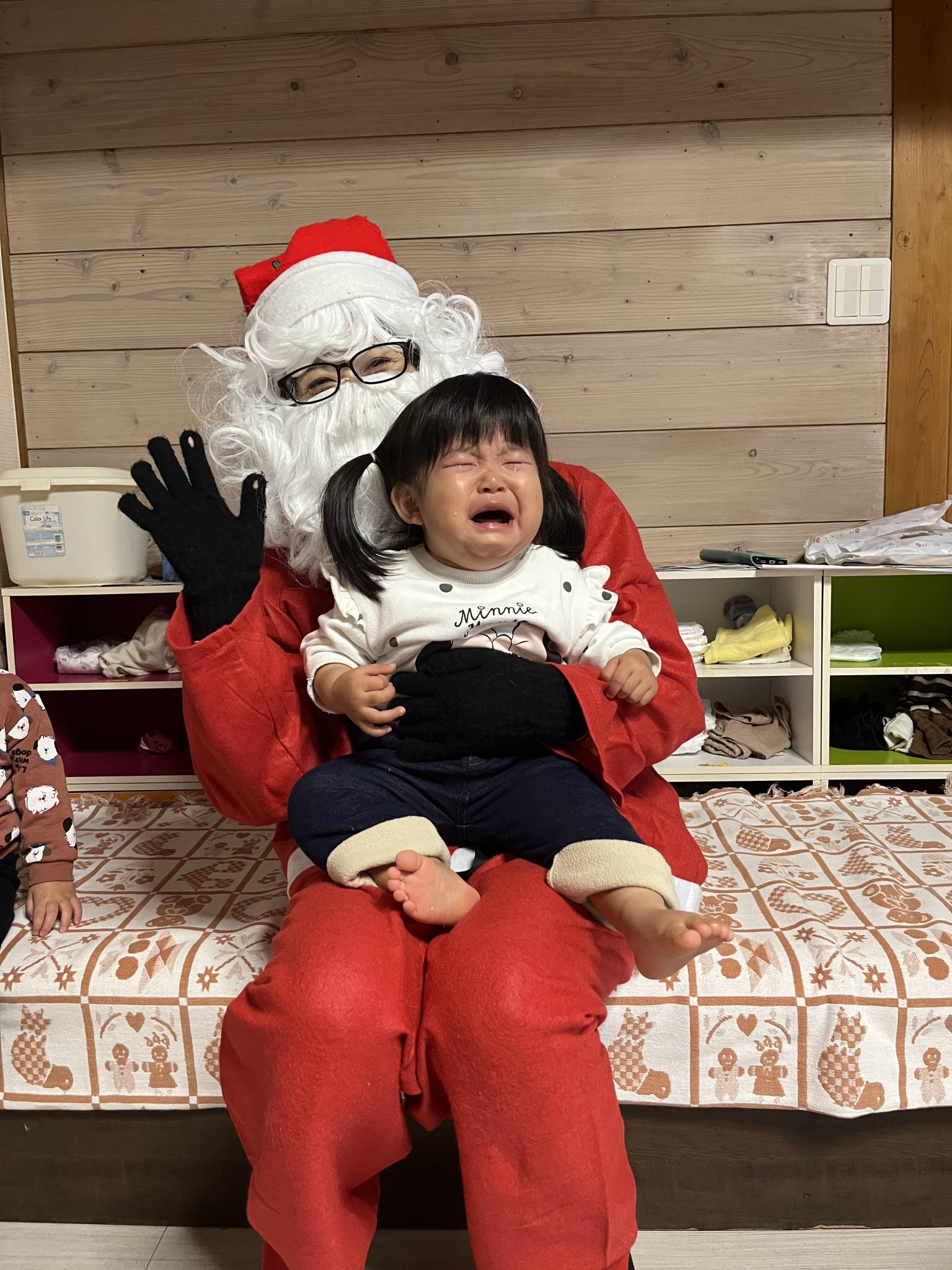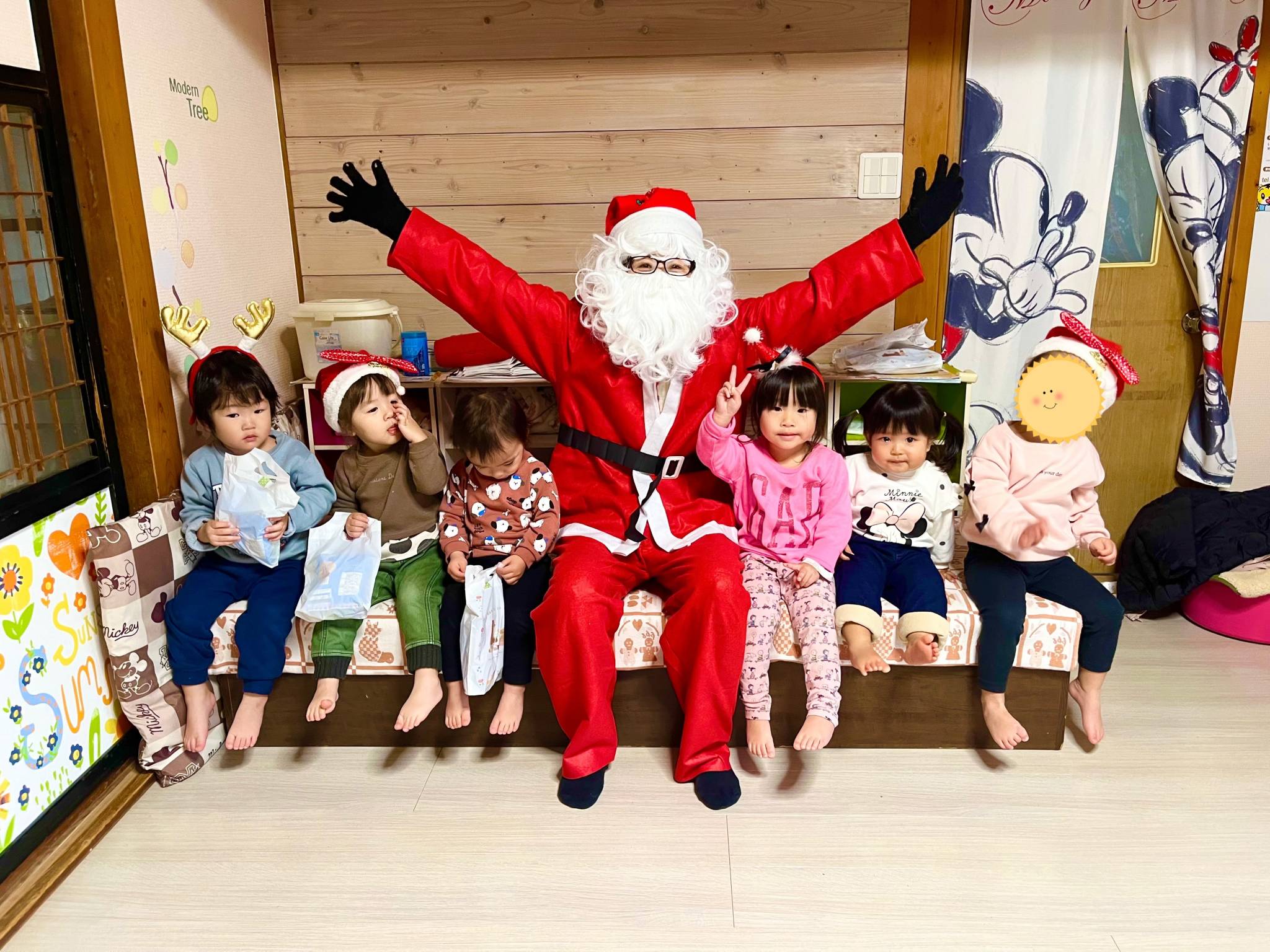 さくらんぼ保育園にサンタさんが来ました。みんなびっくり。体が顔が固まる。笑笑
