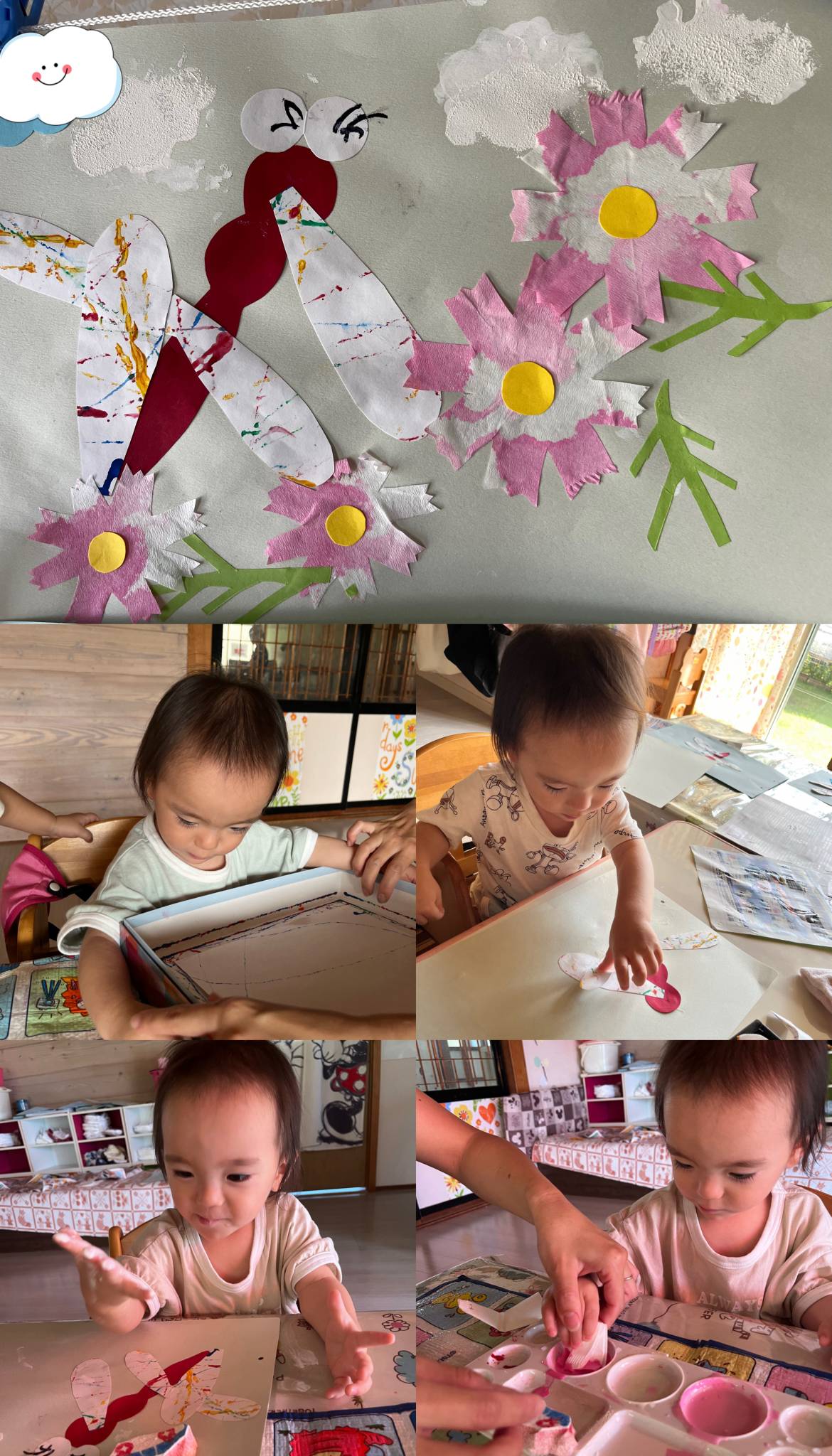 コスモスはにじみ絵で作りました。雲はスポンジでポンポン。「自分でやる」という気持ちが強く手が汚れても平気平気!一生懸命な姿が見れました。