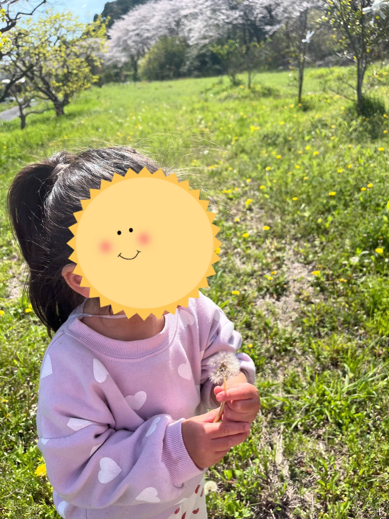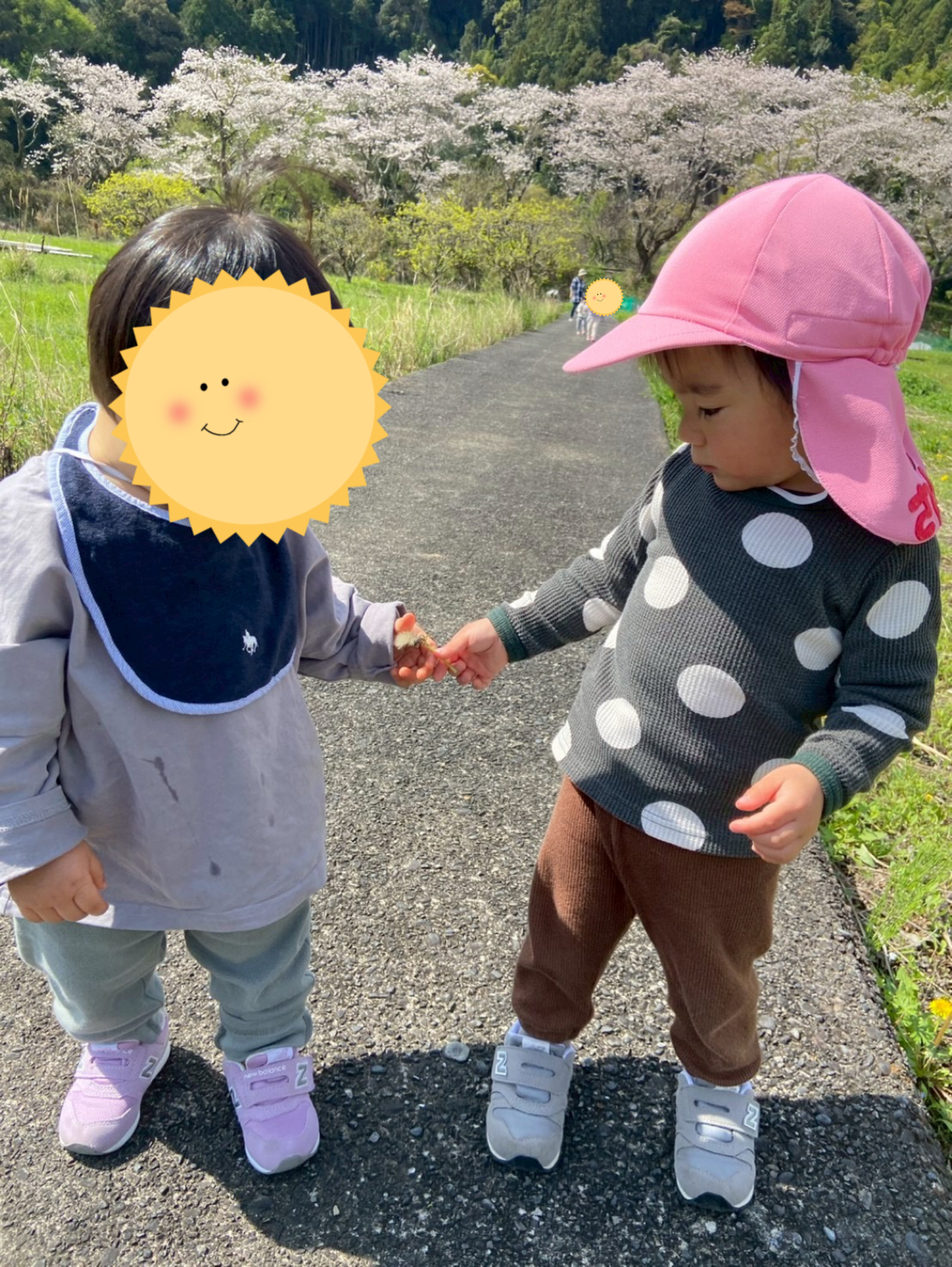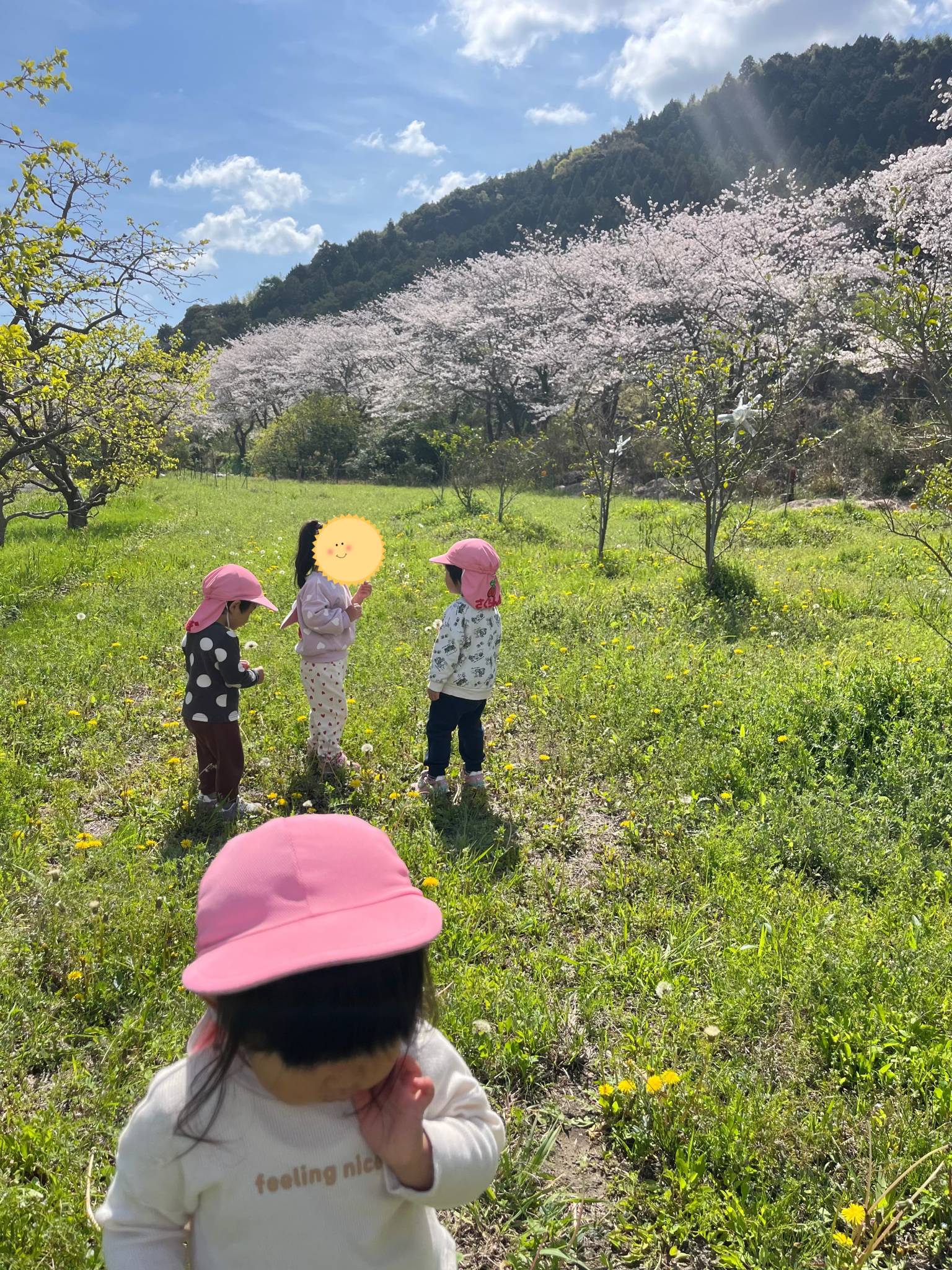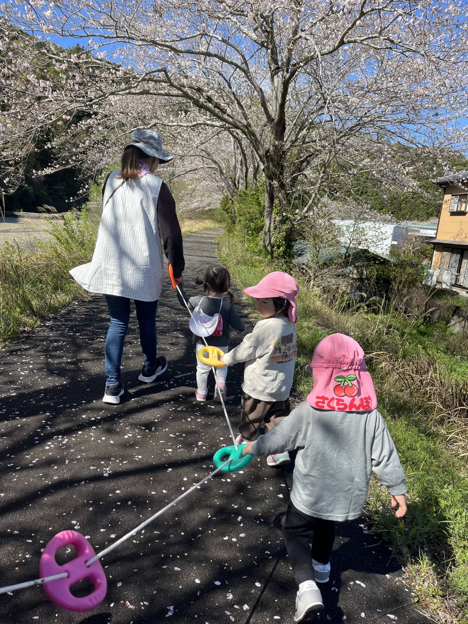 入園式も終わり新しいお友達と初のお散歩。近所の桜も満開。ポカポカ陽気で気持ちの良いお散歩でした。てんとう虫やダンゴムシ、チョウチョ。桜に菜の花。タンポポにスミレ。つくしんぼ。春がいっぱいだったね。これからたくさん楽しい事探しをして楽しんでいこうとおもいます。よろしくお願いします。